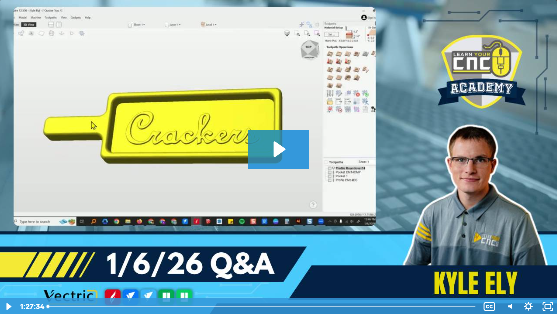 In this Q&A session, we discussed a variety of Vectric and CNC topics, including creating raised text in a pocketed tray , handling rotary projects in VCarve Desktop , and using offsets versus fences for repeatable work. We also covered troubleshooting thread milling settings , aligning vectors for hardware placement , managing large 3D models with background removal tools , and best practices for organizing the Vectric tool database.