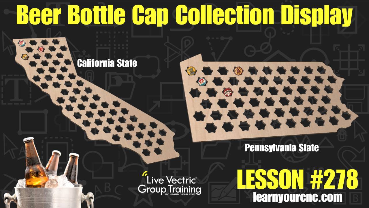 beer bottle cap holder, state map, gift idea, array copy, copy along vectors, nesting tool, trace bitmap, dog bone fillet, pocket toolpath, profile toolpath, pocket allowance, test cuts, beginner project, press fit, vector layout, software efficiency