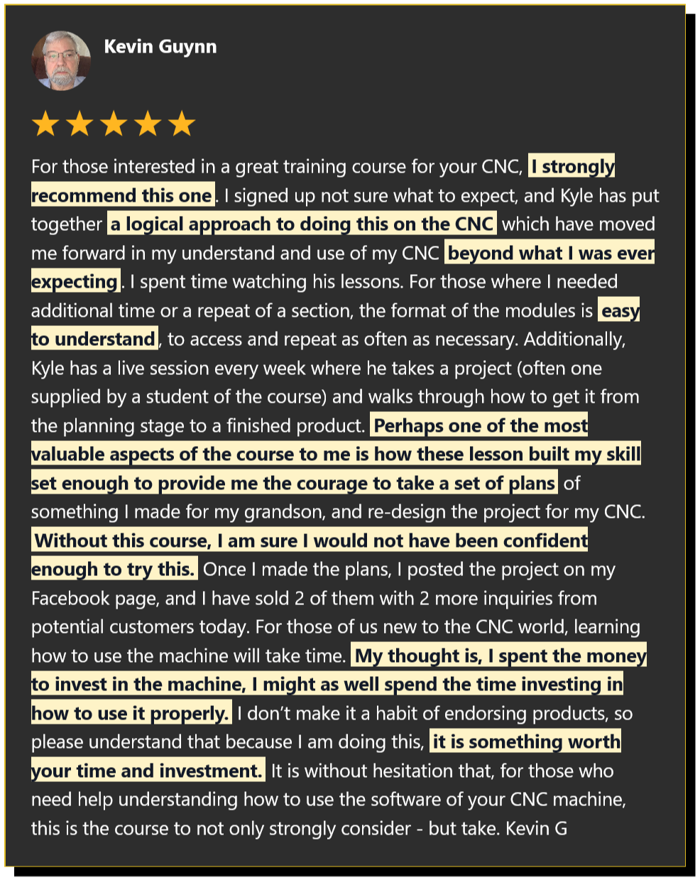 âMy name is Kevin Guynn, and I live in Mentor, Ohio. I have been signed up with Kyle's program since the end of 2020. I signed up because I had purchased a CNC machine, but did not know a whole lot about it.â